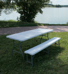 Этот стол имеет раскладной дизайн и изготовлен из полиэтилена высокой плотности HDPE. Размеры стола в разложенном виде составляют 1830х760х740 мм, а в сложенном виде - 915х765х85 мм. Столешница стола белого цвета. Каркас стола изготовлен из стальной круглой трубы диаметром 25 мм и толщиной 1,2 мм. Вес стола без упаковки составляет 15 кг, а с упаковкой - 16 кг. Объем стола составляет 0,073 м3. Такой стол идеально подходит для использования на пикниках, на открытых площадках или в качестве мебели для дачи.