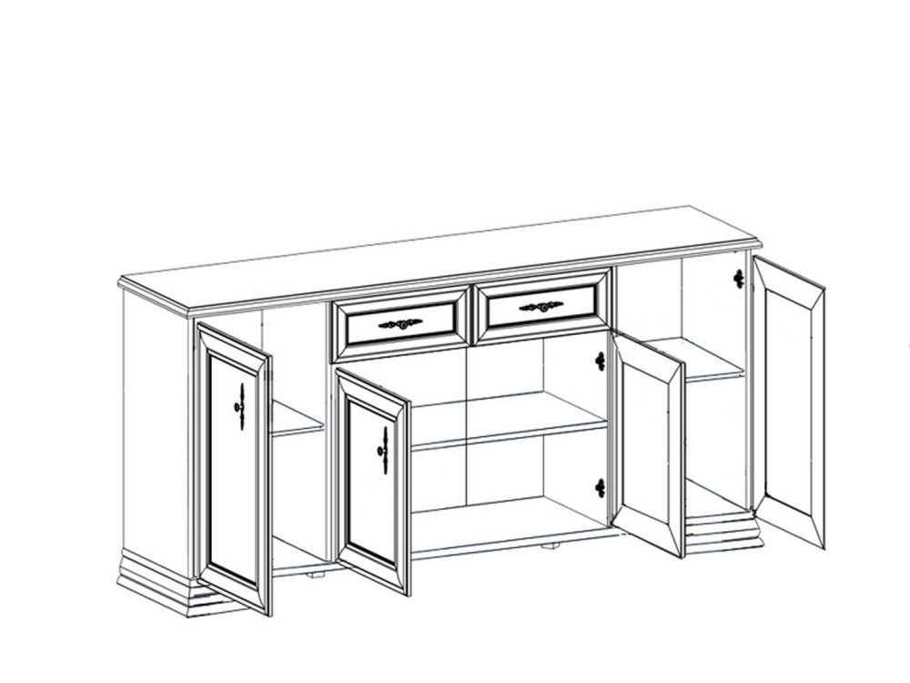 • Тумба разделена на 4 отделения: отделения с полкой за распашными глухими дверями, 2 выдвижных ящика на металлических роликовых направляющих, отделение с полкой за 2-мя распашными дверями.